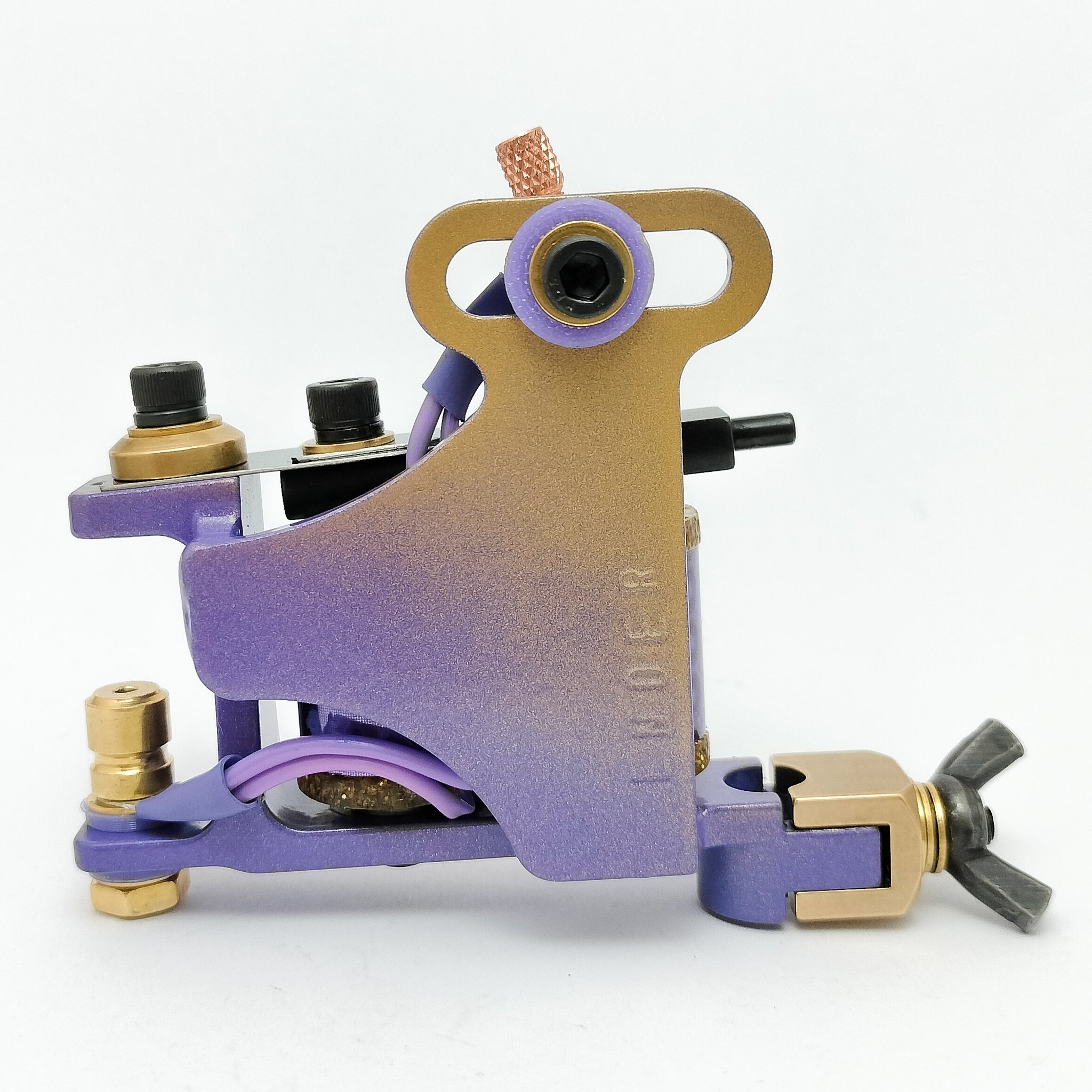 The machine features a rigid, WELD-UP frame with super nice purple and gold fade powdercoat, polished brass bits and hilo scale tape coil double wraps. It also sports my super trusty guillotine vice for clamping on ALL your tubes, steel and disposable.